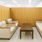 - 現在のレイアウトでは応接スペースにお客様をご案内する際執務室を通る為、執務室を通らない場所に応接スペースを作りたい。また周りをパーテーションで囲みたい。